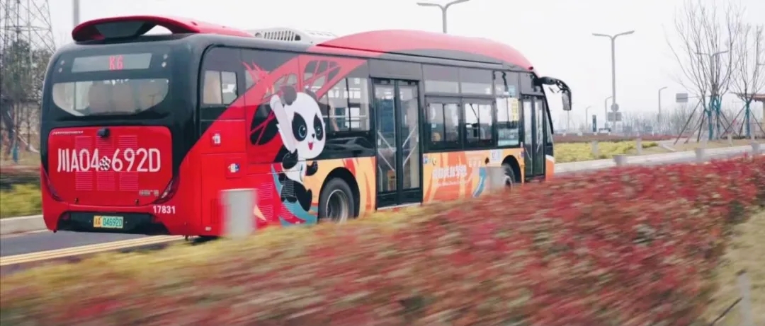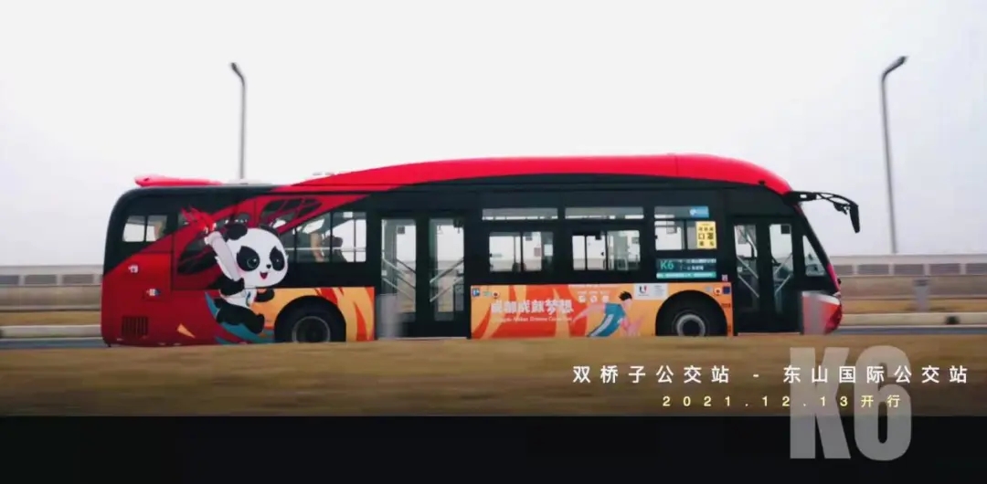 此外K1、K2、K6、K13、锦城观光线、天府机场专线部分车辆,已“穿”上成都大运会同款。车尾的成都大运会吉祥物“蓉宝”动感的形象格外吸睛,一眼就能看出“成都范儿”。蓉宝耳朵、眼睛、尾巴呈火焰形态,它手持“31”字样火焰的火炬欢快地奔跑着。车身中部涂装的“成都成就梦想”六个大字,彰显出浓厚的大运氛围。除此之外,车身上还有金黄色的太阳神鸟,写出成都的文化底蕴。