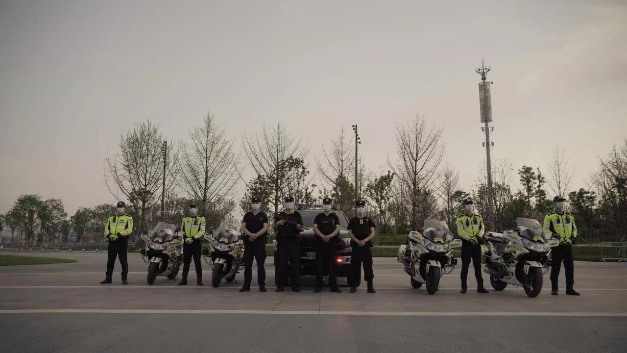 3月18日,夜幕降临,成都大运会奖牌全球发布活动正在东安湖体育公园游泳馆举行。游泳馆的一侧,一支威武帅气、整齐划一的铁骑队正执行着安保任务。