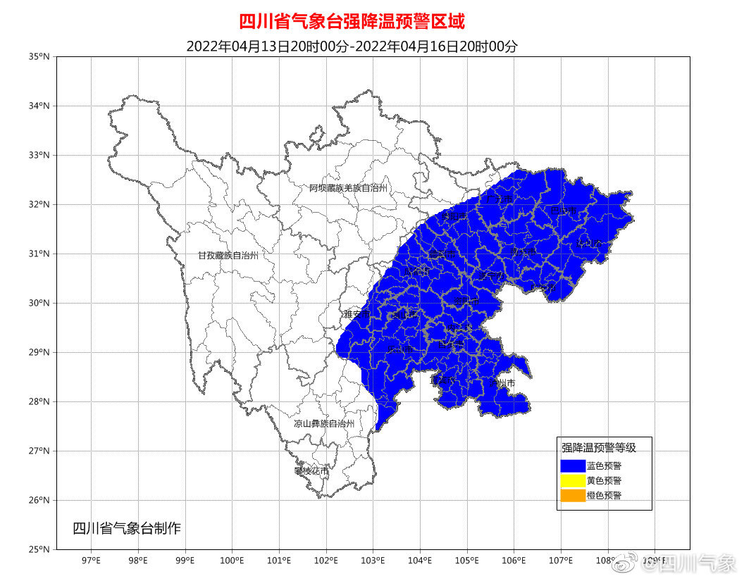 四川省气象台4月13日16时发布强降温蓝色预警:14~16日,受高空低槽和地面冷空气的共同影响,四川省有一次降温降水天气过程,雨量普遍小到中雨,局部大雨;盆地大部地方和凉山州东北部日平均气温将累计下降6~9℃,冷空气影响时有3~5级偏北风。16日盆地最高气温将下降至11~13℃。