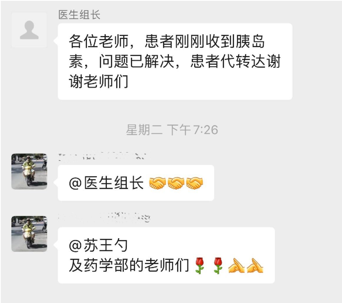 4月13日,微信工作群收到了一条代患者转达的信息——“谢谢老师们”。这原来是方舱药房没有备胰岛素,一位舱内胰岛素用完的糖尿病患者向医疗队发出请求后,方舱医生、方舱药师、长春市人民医院药师密切配合,紧急调用胰岛素。拿到胰岛素的患者拜托舱内工作人员通过微信向我们表示感谢。被@到的我们,仿佛回到了温暖的、鲜花盛开的家乡。
