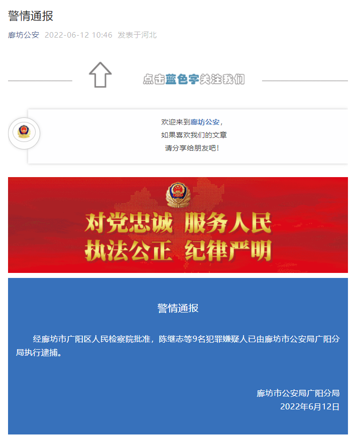 据廊坊公安消息,经廊坊市广阳区人民检察院批准,陈继志等9名犯罪嫌疑人已由廊坊市公安局广阳分局执行逮捕。