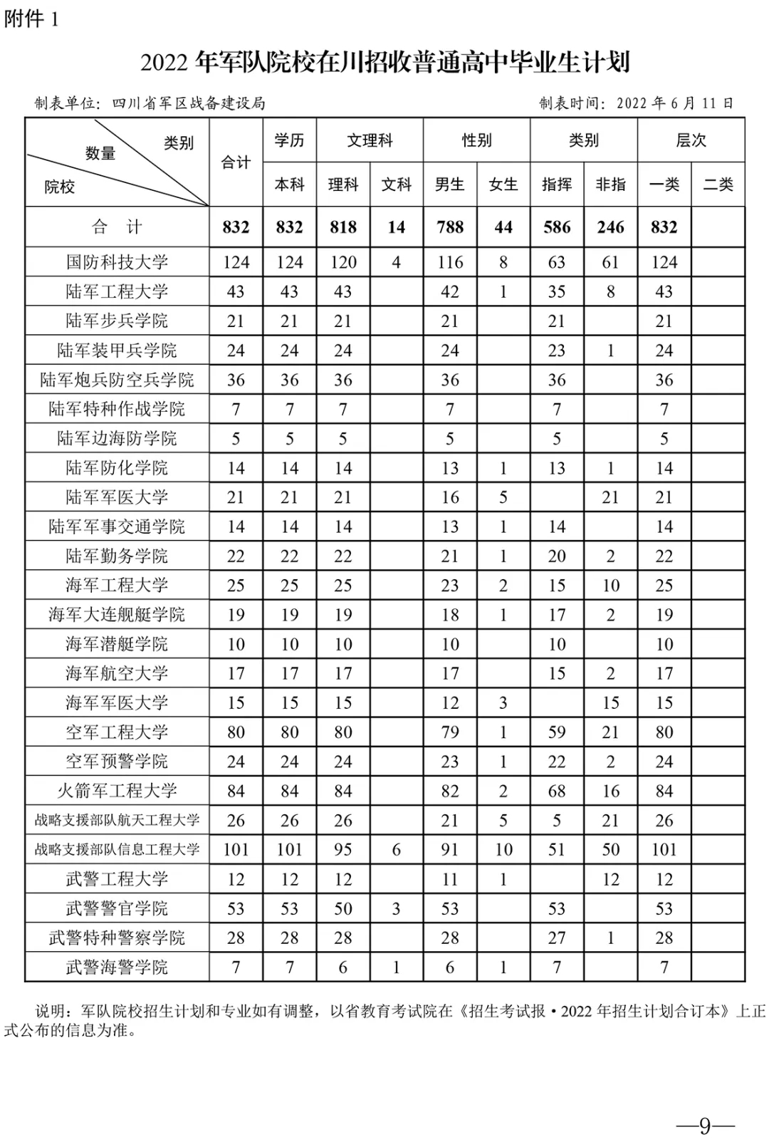今天,看度记者从四川省教育考试院获悉,根据教育部、中央军委政治工作部、中央军委训练管理部《关于做好2022年军队院校招收普通高中毕业生工作的通知》(军训〔2022〕96号),今年25所军队院校计划在川招收普通高中毕业生832人。