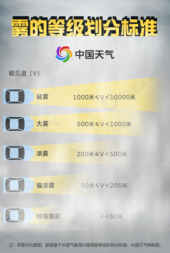 雾是悬浮在近地层大气中的大量微细乳白色水滴和冰晶的可见集合体。根据能见度的大小,可分为轻雾、大雾、浓雾、强浓雾和特强浓雾5个等级。