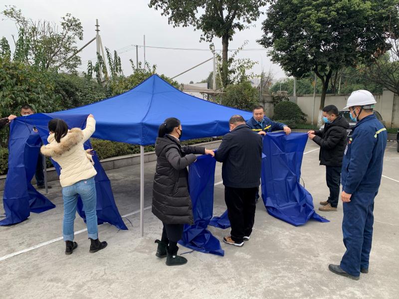 2020年12月11日上午,科创社区在双流油库组织开展新冠肺炎疫情核酸检测应急演练,科创社区临时党委书记带领社区两委成员及工作人员进行实操演练。本次演练模拟了真实的核酸检测情景,主要检验工作人员核酸检测应对能力和组织能力。演练设置了1个检测点,配备了帐篷、条桌、测温枪等核酸检查物资,并进行了检测模拟。