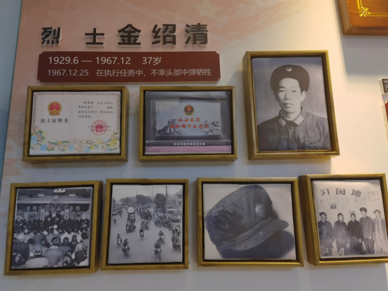 金绍清同志生于1929年,1967年时年37岁的他在执行革命任务时,不幸头部中弹牺牲。长期以来,分局与金绍清同志的家属始终保持密切联系,针对性常态化走访慰问,落实落细关爱工作。金绍清同志的英雄事迹和相关照片展陈分局荣誉室,分局定期组织民辅警特别是青年一代学习金绍清同志的英雄事迹,传承烈士遗志,更好地做好新时代公安机关社会治理、打击犯罪、服务人民各项工作。