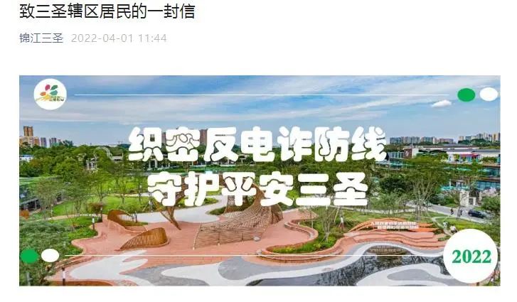 为深化防范电信网络诈骗宣传活动成果,提高辖区居民防范电信网络诈骗的意识和能力,近日,锦江公安三圣派出所创新思维,与街道、社区联动,开展线上“致三圣辖区居民的一封信”反诈宣传活动,呼吁广大群众练就“火眼金睛”,安全地捂好自己“钱袋子”,切勿上当受骗。