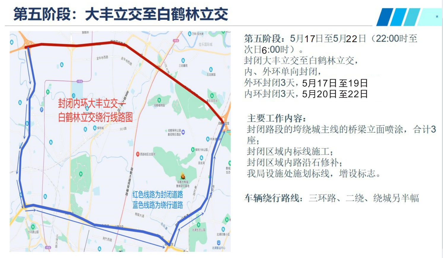 2022年5月17日至5月19日的每日22:00至次日6:00,成都绕城高速(G4202)白鹤林立交至大丰立交的高速路段外环封闭施工,禁止机动车通行;2022年5月20日至5月22日的每日22:00至次日6:00,成都绕城高速(G4202)大丰立交至白鹤林立交的高速路段内环封闭施工,禁止机动车通行。在此期间,大丰立交、北新收费站、货运大道收费站、三河场收费站、白鹤林立交通往绕城高速施工路段的匝道同步封闭。