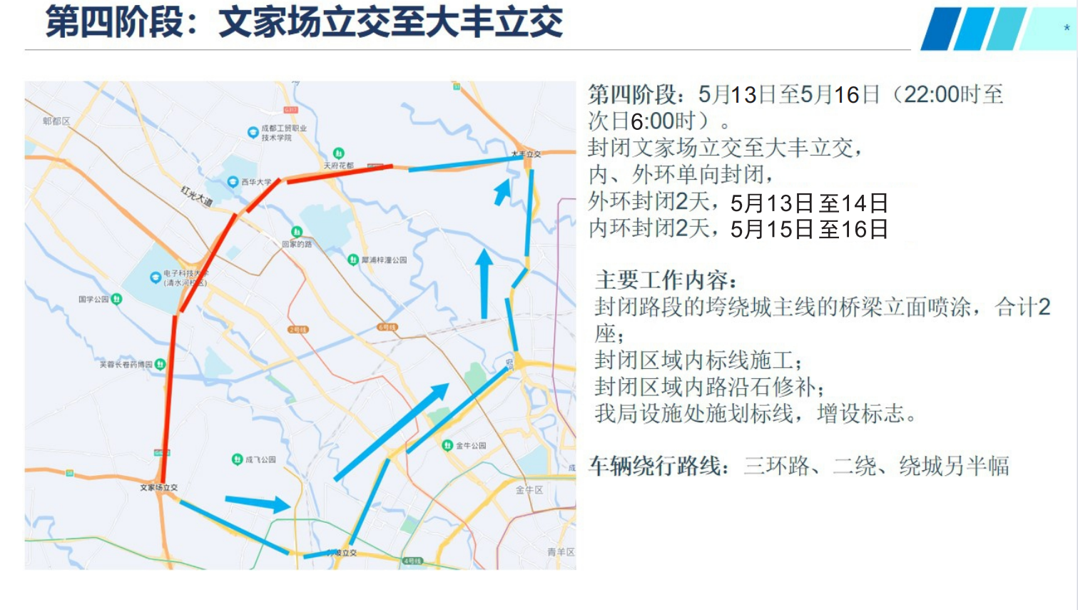 2022年5月13日至5月14日的每日22:00至次日6:00,成都绕城高速(G4202)大丰立交至文家场立交的高速路段外环封闭施工,禁止机动车通行;2022年5月15日至5月16日的每日22:00至次日6:00,成都绕城高速(G4202)文家场立交至大丰立交的高速路段内环封闭施工,禁止机动车通行。在此期间,永宁收费站、成灌收费站、蜀源大道收费站、大丰立交、绕西服务区通往绕城高速施工路段的匝道同步封闭。