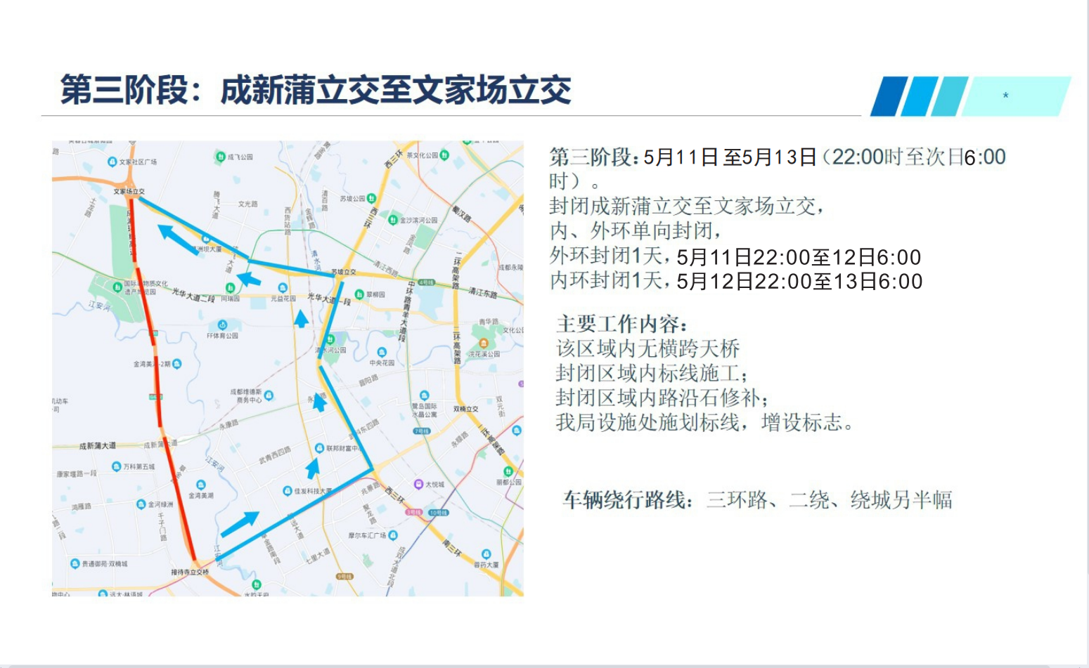 2022年5月11日22:00至5月12日6:00,成都绕城高速(G4202)文家场立交至成新蒲立交的高速路段外环封闭施工,禁止机动车通行;2022年5月12日22:00至5月13日6:00,成都绕城高速(G4202)成新蒲立交至文家场立交的高速路段内环封闭施工,禁止机动车通行。在此期间成新蒲立交、绿舟立交、文家场收费站通往绕城高速施工路段的匝道同步封闭。