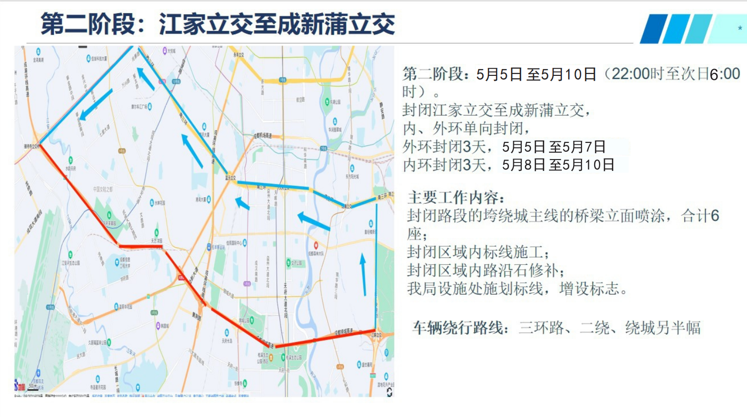 2022年5月5日至5月7日的每日22:00至次日6:00,成都绕城高速(G4202)成新蒲立交至江家立交的高速路段外环封闭施工,禁止机动车通行;2022年5月8日至5月10日的每日22:00至次日6:00,成都绕城高速(G4202)江家立交至成新蒲立交的高速路段内环封闭施工,禁止机动车通行。在此期间,蓉遵高速(G4215)、天府收费站、锦城湖收费站、京昆高速(G5)成雅高速段、白家收费站、成都机场收费站、接待寺立交双流收费站、成新蒲立交通往绕城高速施工路段的匝道同步封闭。