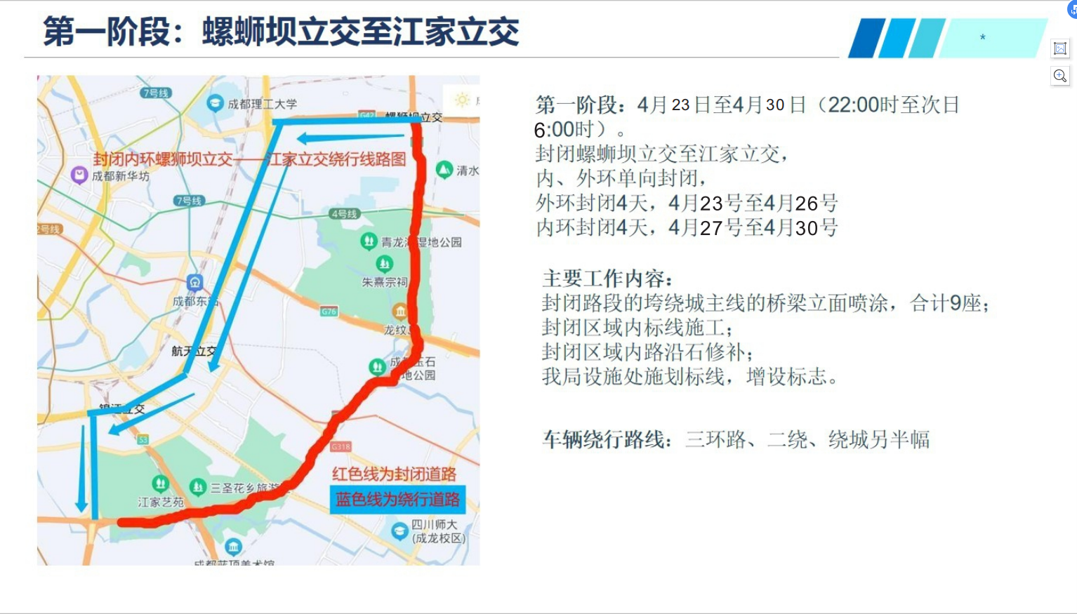 2022年4月23日至4月26日的每日22:00至次日6:00,成都绕城高速(G4202)江家立交至螺丝坝立交的高速公路段外环封闭施工,禁止机动车通行。4月27日至4月30日的每日22:00至次日6:00,成都绕城高速(G4202)螺丝坝立交至江家立交的高速公路段内环封闭施工,禁止机动车通行。在此期间,沪蓉高速(G42)成南高速段、渝蓉高速(G5013)成安渝高速段、成龙收费站、成资渝高速(S3)天府国际机场高速段、蓉遵高速(G4215)、绕东服务区的通往绕城高速施工路段的匝道同步封闭。