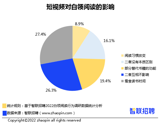 谈及短视频与阅读的关系,智联招聘数据显示,虽然有27.4%的白领表示短视频蚕食了他们的读书时间,占比排在首位。但是也有26.3%的白领认为短视频和阅读分别承担“娱乐”和“学习”的功能,互不影响;19.4%的白领认为短视频的搜索、推荐等功能部分替代了书籍的功能,还有16.1%认为看短视频也可以达到学习的目的,在这一点上,二者没有本质区别;仅8.9%的白领认为短视频改变了阅读习惯。