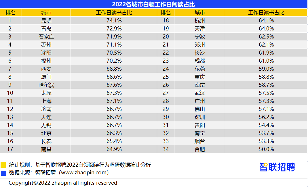 在如今快节奏的社会,静下心来下阅读似乎变成了一种奢侈。不过,当你迷茫的时候,有的人正在通过阅读寻找答案,了解更大的世界!尤其是疫情反扑的当下,如果不能“行万里路”,不如将时间用在读书上。希望本次报告可以唤醒白领们内心对阅读的渴望。孟德斯鸠曾经说过:“读书对于我来说是驱散生活中的不愉快的最好手段。没有一种苦恼是读书所不能驱散的。”如果你因为工作的内卷而焦虑,因为生活的琐碎而烦闷,或是因为疫情等感到彷徨、需要治愈,就去读书吧!毕竟“再没有比读书更平价的娱乐,更持久的满足了”。(图片由智联研究院提供)