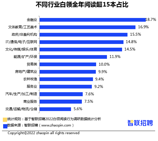 从行业角度来看,金融业的从业人员一年阅读量在15本以上的占比最高,达到了18.7%。其次是文体教育行业,占比达到16.9%。金融精英往往需要通过阅读书籍来填充自己的专业知识,要想在金融圈的浮沉里争上游,多读书可能是关键的一步哦。