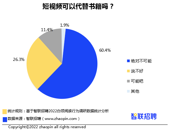 短视频会取代书籍吗?对于这个问题,表示“绝对不可能”的白领人数占比最大,为60.4%;而表达“说不好”或“可能吧”观点的人数占比分别为26.3%和11.4%。开个脑洞,在科幻电影里,光脑,植入芯片等概念层出不穷,人们也不再需要读书。小伙伴们认为这些都会实现吗?