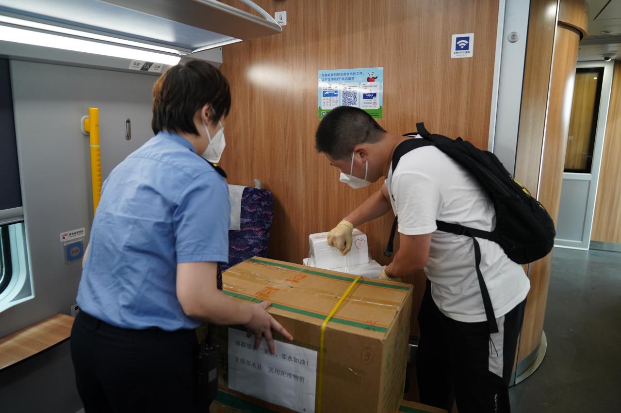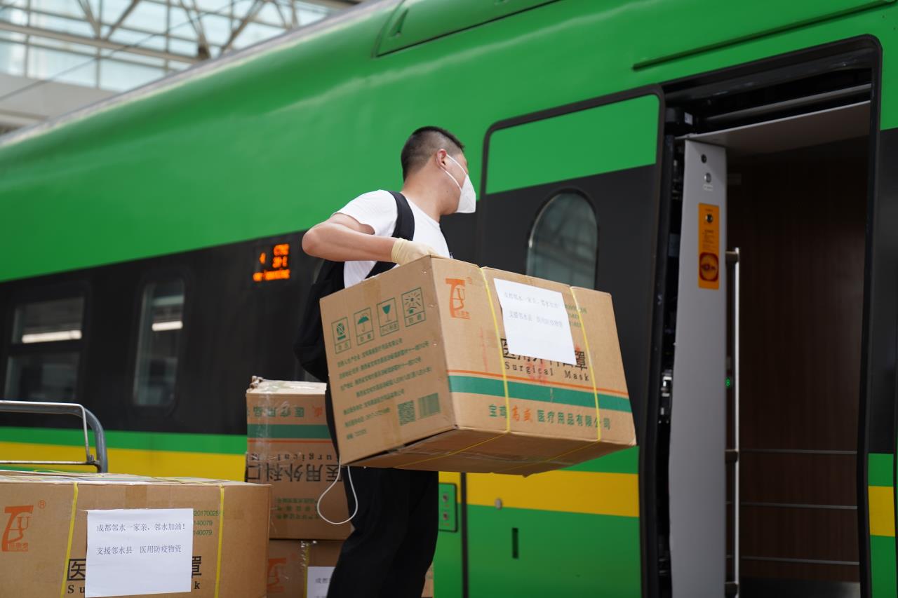“大家加把劲儿,今天晚上邻水县的志愿者们就能用上我们的物资了!”成都车站东运转车间职工何华平一边将一箱箱支援物资搬上列车,一边给同事鼓劲儿。