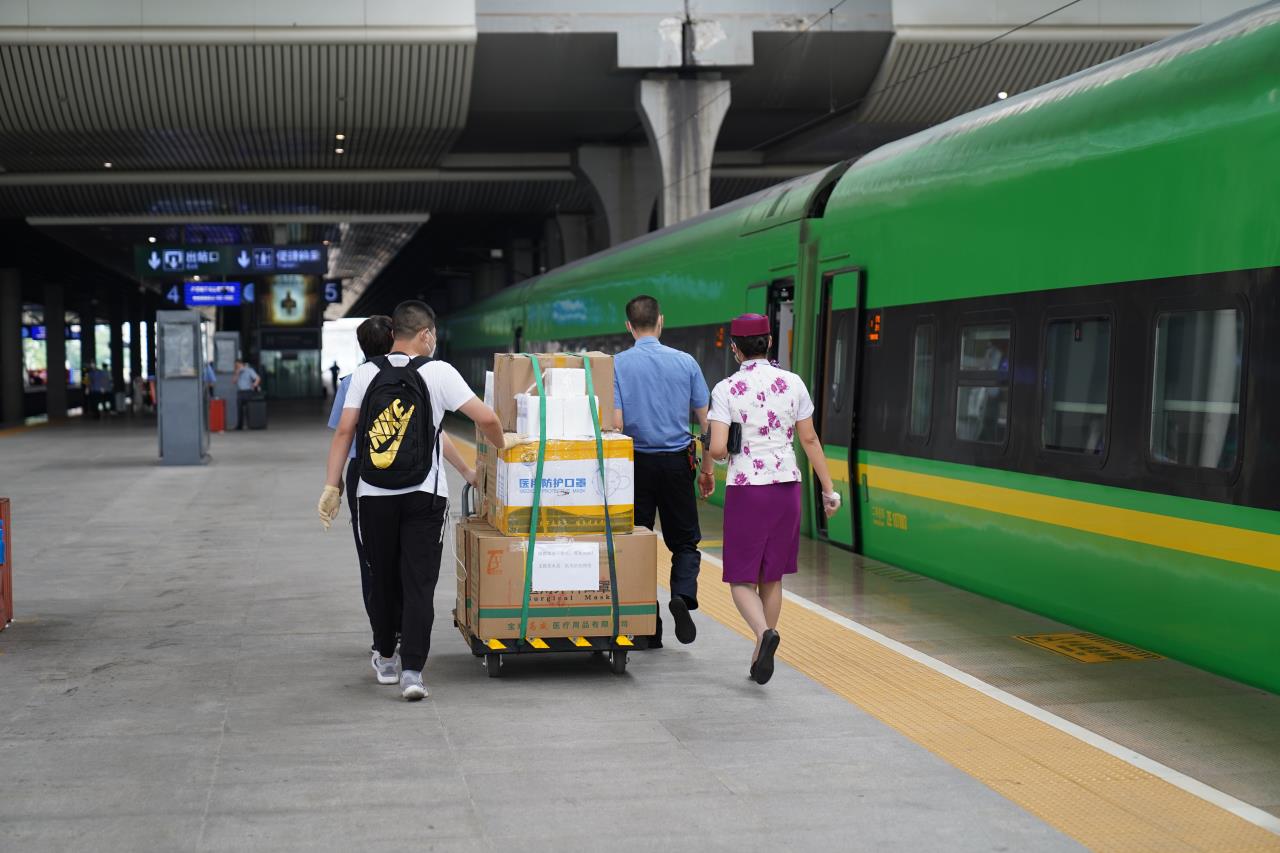 14点38分,C792次复兴号动车组列车缓缓驶出成都东站,约1900个医用N95口罩、6000个医用普通口罩以及风油精、遮阳帽等共计十余件物资将于当天送到邻水县青年志愿者的手中。