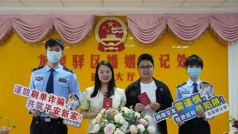 5月20日,龙泉驿区民政局的领证大厅门口,龙泉驿公安刑警大队的民警们手中提着精致的礼品袋,为排队领证的新人送上了一份特别的心意,每个袋子里都装着一朵玫瑰、公安纪念钥匙扣和反诈宣传单。