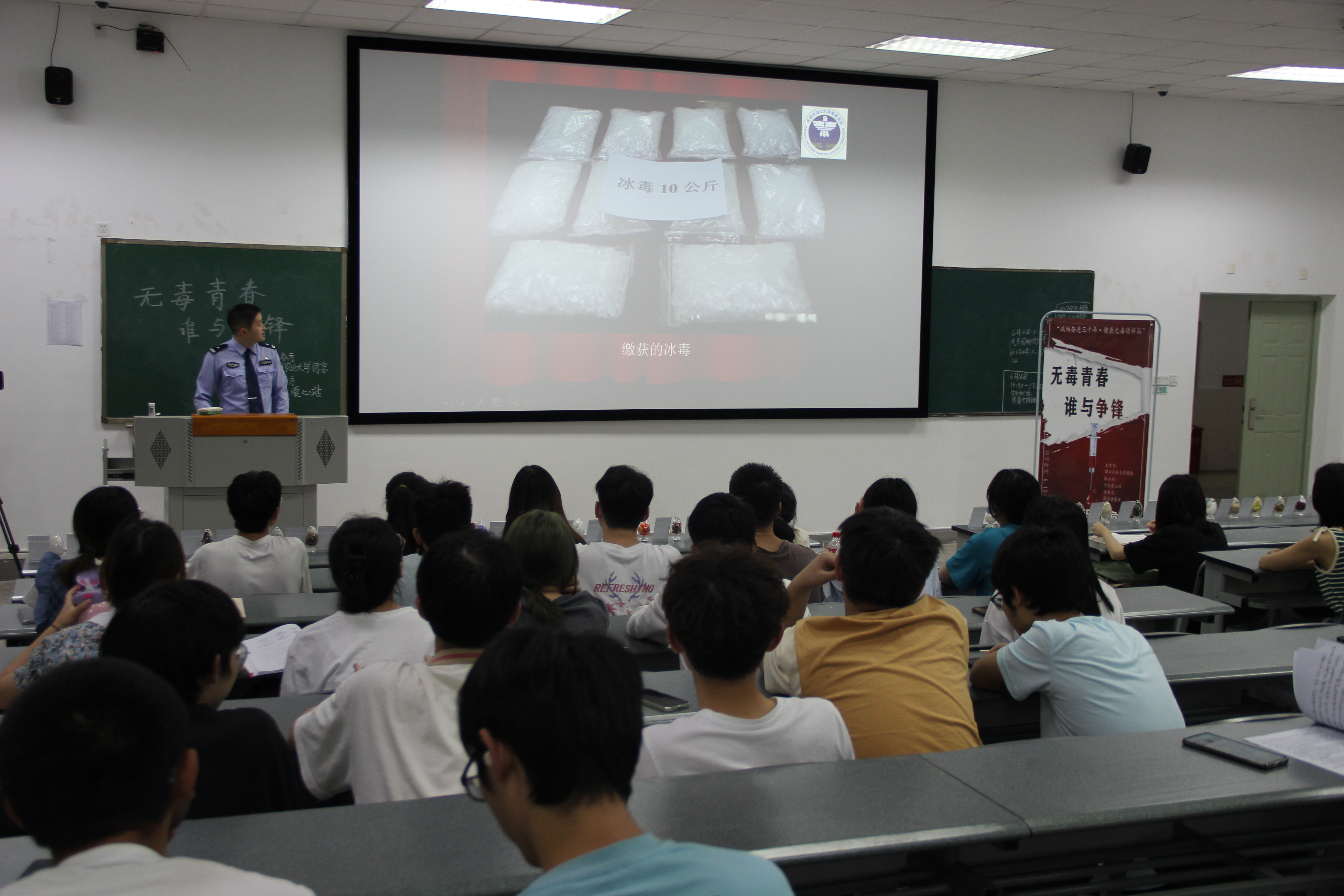 为全面夯实高校禁毒阵地,持续增强全区大学生识毒、防毒、拒毒意识,6月,温江区禁毒办积极组织相关单位深入高校开展禁毒主题宣传活动。温江分局禁毒大队深入四川农业大学开展了以“无毒青春,谁与争锋”为主题的禁毒知识讲座。讲座中,禁毒大队民警通过PPT课件、禁毒视频、有奖互动问答等形式向现场200余名大学生代表讲解了毒品的危害,传授了识毒、防毒、拒毒等知识,倡议大家从自身做起,坚决抵制毒品,享受绿色无毒人生。同学们纷纷表示,今后一定会不断丰富禁毒知识,坚决远离毒品,积极带动身边的家人朋友共同参与到禁毒宣传工作中来,为国家禁毒事业做出新时代青年人应有的贡献。