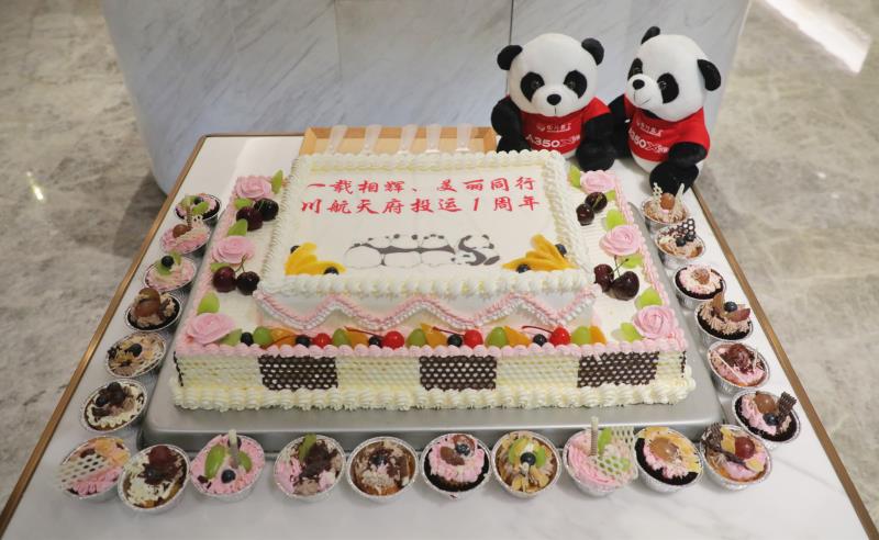 27日,在3U6515成都天府-乌鲁木齐航班上,乘务组邀请旅客参与“天府机场知多少”问答互动,并为旅客送上礼物;在天府机场川航两舱休息室,工作人员特别准备了“开航一周年”特色餐食邀旅客品鉴,包括红烧鱼、狮子头、天府豆花、限定款纸杯蛋糕等。