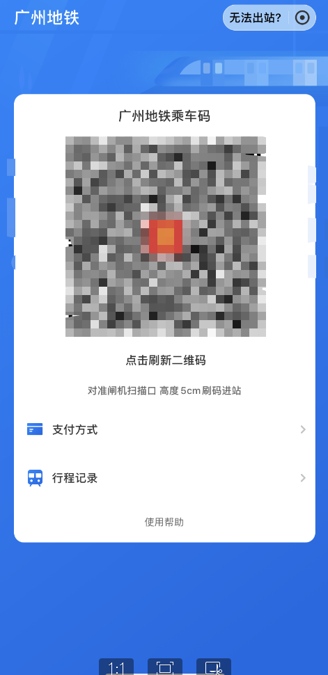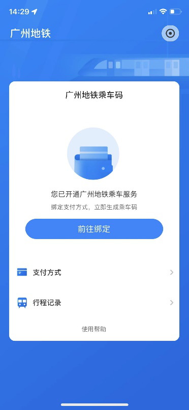 使用“成都地铁APP”第一次在广州乘坐地铁时,需要点击APP菜单栏中间的【乘车】按钮,点击乘车码左上角切换“广州地铁”,同意漫游协议,绑定支付方式,即可生成乘车码,进入广州地铁乘车页面,实现异地乘车。