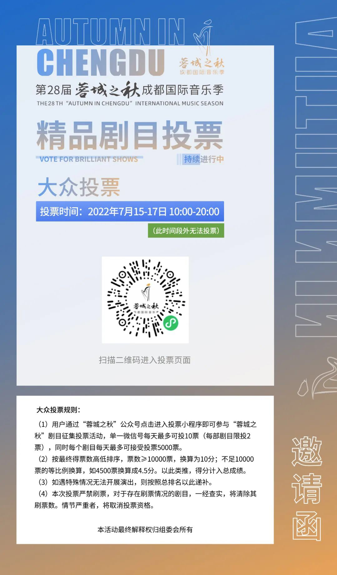 第28届“蓉城之秋”精品剧目的评选由媒体代表及行业机构投票、大众投票、专家评审三个环节组成,评选结果将综合三个环节的总分进行排名。人人都可以“票选”你喜欢的剧目。