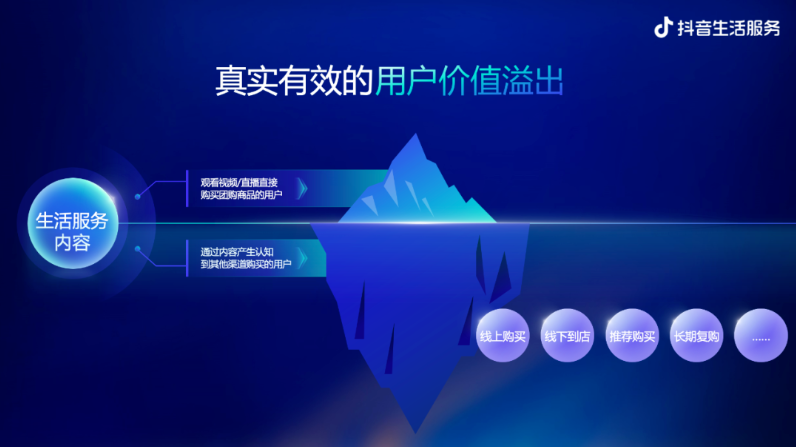 一开始的时候我简单地提到过,有客户表示在抖音做生活服务之后,不仅仅可以直接获得来自抖音的订单,感觉整体生意都比之前好了一些。我们过去也做了很多测试来反复验证这一点,我们发现,这种感受是很准确的,也很普遍。抖音上的内容会增加用户对你品牌的认知,会记住你的品牌和店铺,其中只有一部分会直接转化成核销订单,还有非常大的比例进行了外溢,这种价值的外溢,让一部分用户直接来到了你的店铺里,还有的外溢到了你的其他网络平台店铺。我们发现这个外溢比例,平均可以达到1:1。在抖音生活服务,我们发现内容产生的品牌价值并不是虚的,它可以直接带来转化效果。