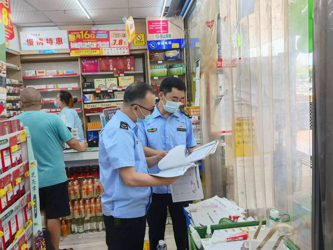 检查现场,重点针对零售药店落实四类药品购买登记、各经营单位从业人员开展“三天两检”核酸检测等情况,督促药店、农贸市场、商超、餐饮经营单位等市场主体落实疫情防控措施进行检查。