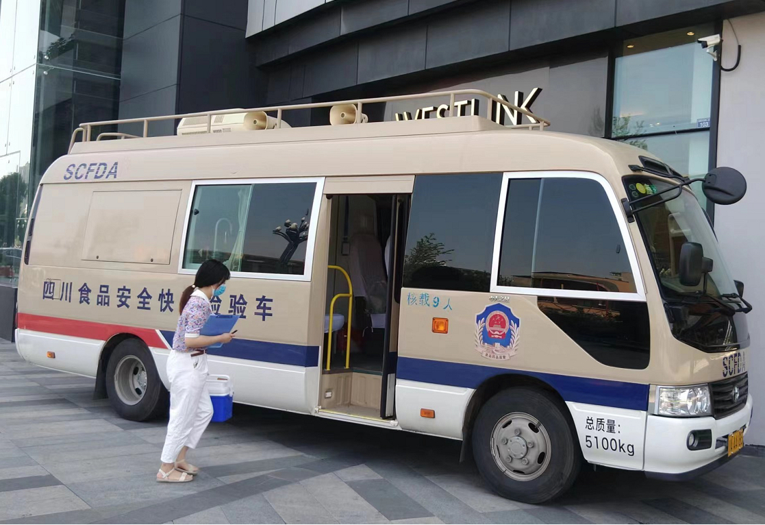一辆食品安全快速检验车停在大丰邻你超市附近,工作人员提着快检箱正急匆匆登车。