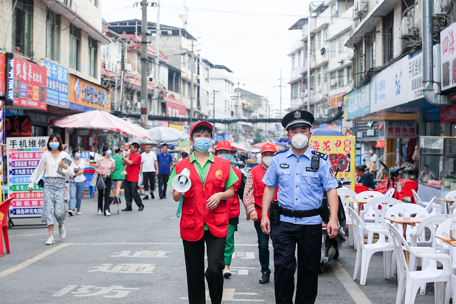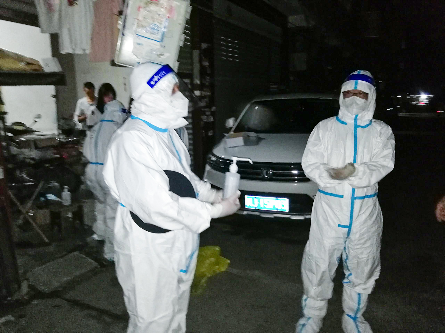 “邓哥,把防护服拉好,面罩,面罩,我再给你弄一下。”“小杨,你也是,我再给你检查一下。”7月23日晚十时许,昏黄的灯光下,邓楠和辅警杨益亮着手机手电筒,再次相互检查和提醒着。随后,他们和医护人员、街道党员志愿者进入高风险封控区核心区域逐户逐层开展入户核酸检测工作,直到24日凌晨2点,369人全部完成核酸检测。