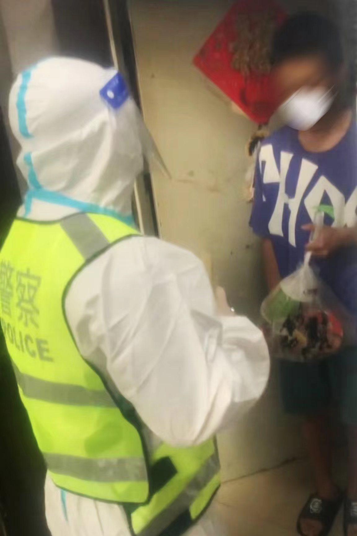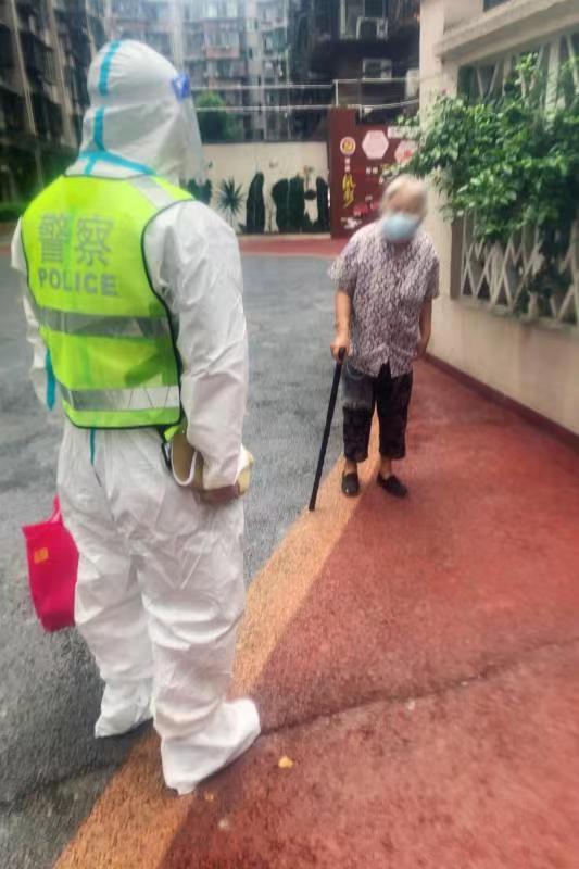 日常工作中,穿上防护服、变身警察“大白”的李浚豪还会参与到巡逻工作中。7月26日这天下午,正在小区巡逻的李浚豪发现一名老人独自下楼闲逛,已经走到了单元楼前,他赶紧上前劝阻。原来,老人因为耳背不清楚外面的情况,想要走出家门找人问问。当了解到老人也有一个当警察的儿子时,李浚豪指着身上印有“警察”二字的反光背心,套近乎似地说道:“婆婆,你看!我跟你们娃娃是同事,是他叫我们来看望你的,快跟我们一起回屋了!”