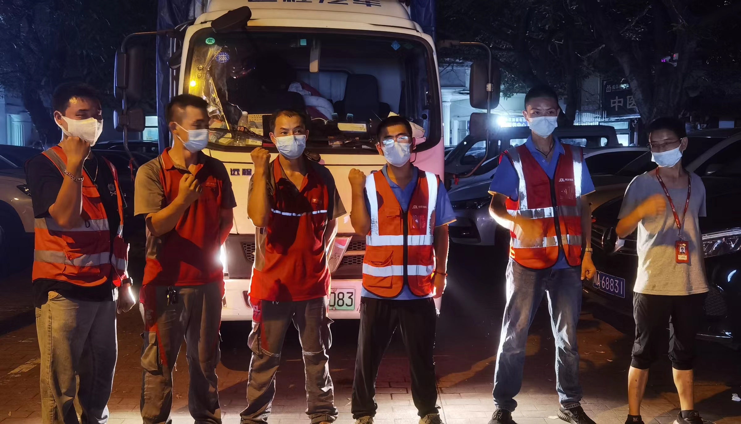 志愿者和京东小哥卸完首台蔬菜