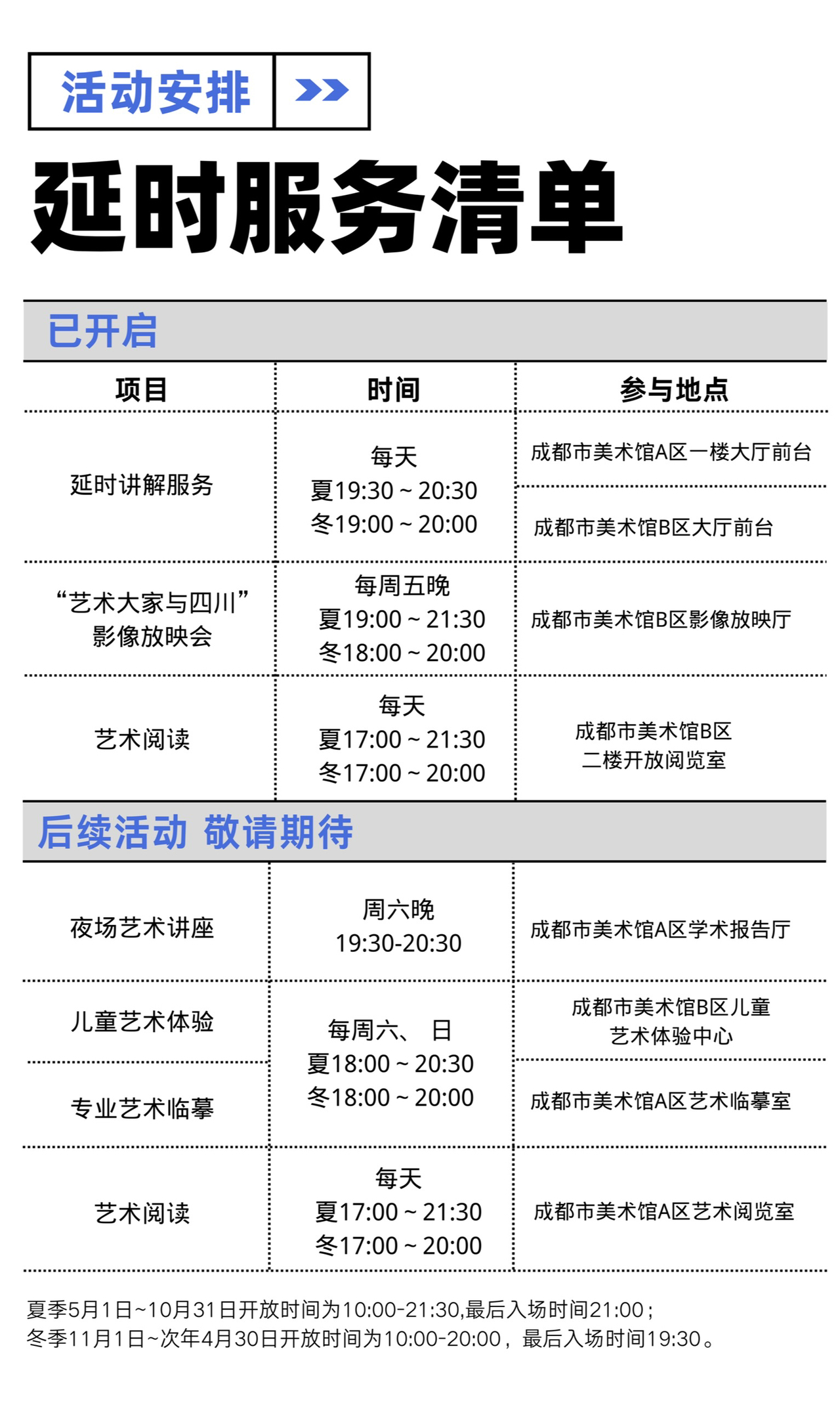 为了迎接观众们的观展热情,成都市美术馆的新预约平台8月15日已经上线微信平台,观众只需进入“成都市美术馆”公众号,点击“预约服务”-“观展预约”中的展览海报,选择合适的参观时段,输入身份信息,便可入馆参观。新馆的延时服务也将照常进行,不论上班族还是学生党,都可以在傍晚后尽情享受看展的乐趣。新馆开闭馆时间为夏季(5月1日~10月31日)10:00-21:30,最后入场时间21:00;冬季(11月1日~次年4月30日)10:00-20:00,最后入场时间19:30(每周一例行闭馆)。