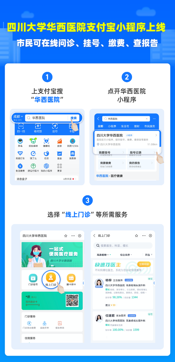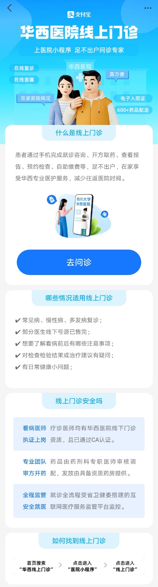 记者用支付宝APP体验发现,只需要上支付宝搜索“华西医院”,进入医院小程序后,就能使用线上门诊(手机上直接问医生)、门诊挂号(预约医生线下门诊号源)、报告查询等功能。这对于部分慢性病及复诊患者无需出门就可以找华西医院的专家看病开药,真是太方便了!