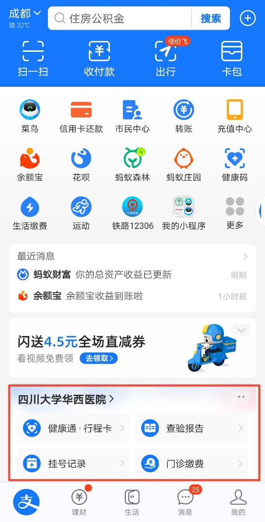 此外,对于已经抵达华西医院的就医市民来说,支付宝首页醒目位置会自动出现华西医院专区,市民通过该专区可直接点击查看挂号记录、查验报告等。