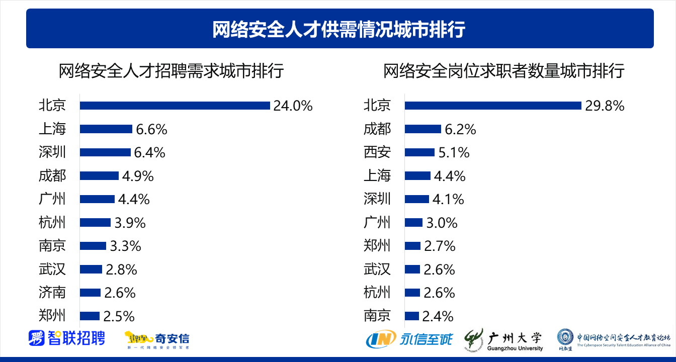 智联招聘数据显示:北京、上海、深圳、成都、广州是网络安全人才需求量最大的城市,这五个城市对网络安全人才需求的总量占全国需求总量的46.3%。相较于2021年需求量前五的城市占全国的44.2%,今年的需求占比总和比去年增长2个百分点。