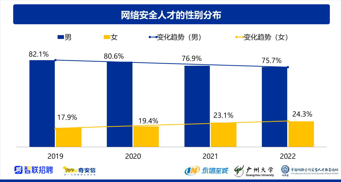 通过对应聘网络安全岗位的求职者简历分析,网络安全人才中女性占比24.3%,男性占比75.7%。通过近四年的网络安全人才性别分布对比,我们发现,网络安全人才中女性占比正在稳步上升,从2019年的17.9%,至2022年已经达到24.3%。虽然男性依旧是网络安全人才的主体,但网络安全行业大多岗位对性别的要求已经微乎其微,且越来越多的女性更加关注网络安全行业,同时愿意进入网络安全行业从事相关工作。(图片由智联招聘提供)