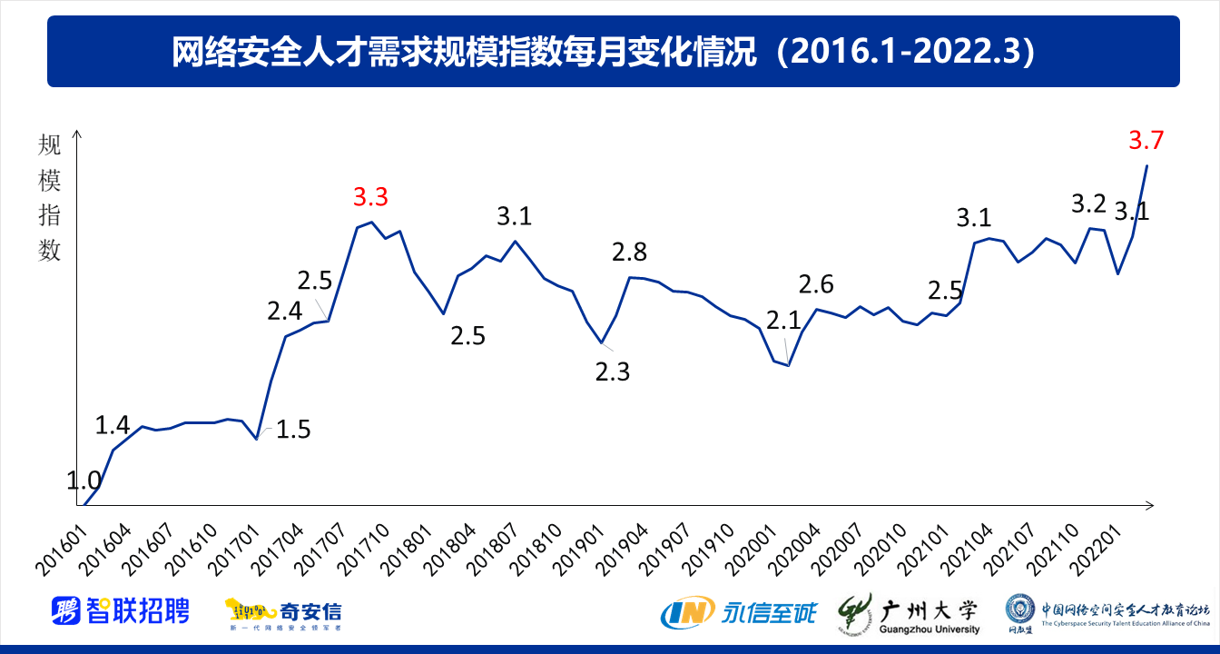 2019年3月至2021年1月,受全球疫情和整体经济环境影响,安全人才的需求有所下降,岗位需求数增长逐渐放缓。到2021年7月,指数恢复至3.0并开始逐步增加。