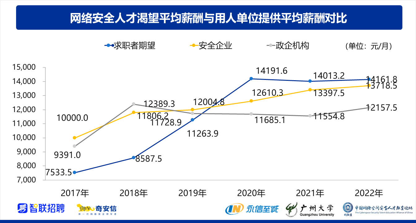 统计显示,2022年求职者期望的平均薪酬约为14161.8元/月,较去年增加了148.6元/月。但今年求职者的期望薪酬依然要高于用人单位提供的平均薪酬,政企机构提供的网络安全相关岗位的平均薪酬约为12157.5元/月,安全企业提供给网络安全相关岗位的平均薪酬约为13718.5元/月。
