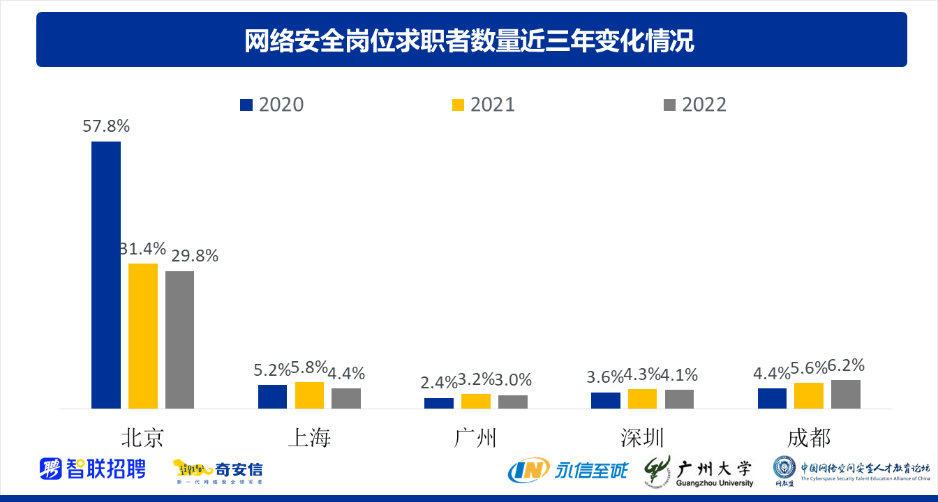 而从人才供给情况来看,在网络安全岗位求职者数量排行榜上,排名前五的城市为:北京、成都、西安、上海、深圳。近年来,全国人才供给情况,整体来看正在“逐步下沉”,求职者比例在北京地区的集中情况也正在缓解。位于北京的求职者占比从2020年的57.8%降低至2022年的29.8%。在持续需求的趋势下,全国各地加大对网络安全人才的培养力度,且各地网络安全人才的就业环境和政策在日渐改善。这是网络安全人才从北京分散至各地的主要原因。预计在未来如此跳变式下降的情况很难复现,但稳步下降的趋势将会延续。