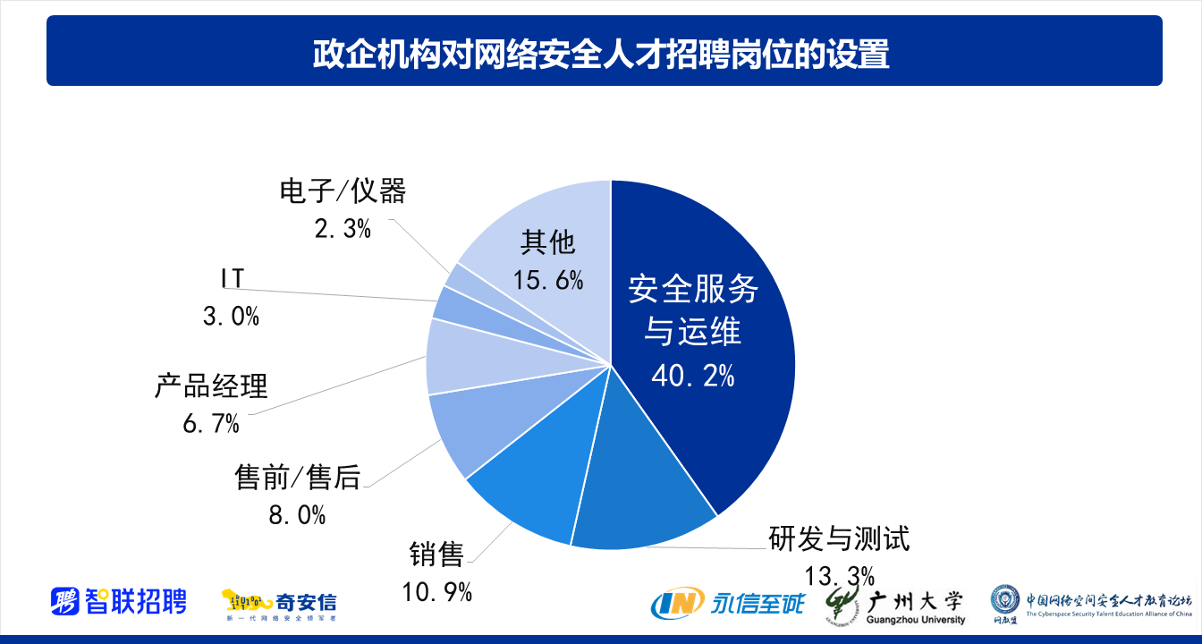 通过对用人单位招聘岗位进行统计与分析,我们发现,安全服务与运维类岗位需求量最多,占40.2%,与2021年占比基本持平,可见近两年企业一直对安全服务与运维岗位有大量需求,用人单位大多非常重视网络安全的基础运营工作。其次是研发测试类岗位,占比13.3%。