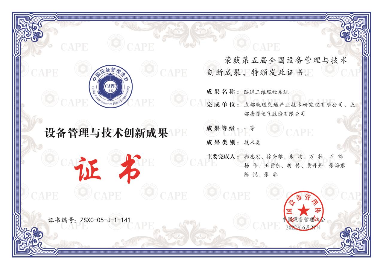 近日,成都轨道产投集团下属成都轨道交通产业技术研究院有限公司牵头研发的“隧道三维巡检系统项目”,经中国设备管理协会专家组初审、复审,荣获第五届全国设备管理与技术创新成果一等奖。