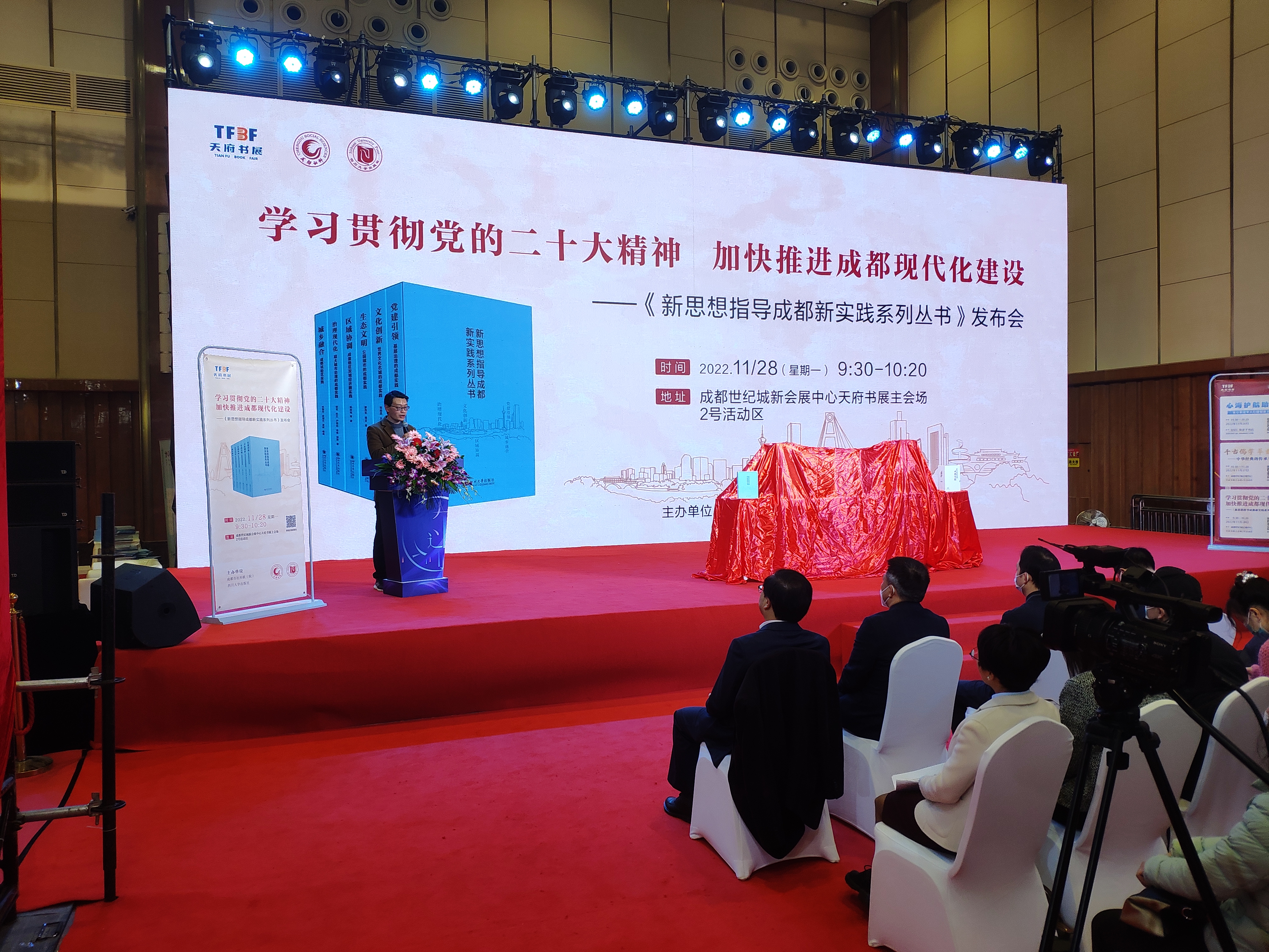 为学习贯彻党的二十大精神,积极宣传新思想指导下的成都生动实践,11月28日上午,由成都市社科联(院)组织实施的《新思想指导成都新实践》《新发展理念的成都实践》两部系列丛书在天府书展重磅发布。中共成都市委宣传部副部长师江,成都市社科联(院)党组书记、院长姚凯,成都市社科联(院)副院长阎星,四川大学出版社和期刊社党总支书记庞国伟,四川大学出版社社长侯宏虹,以及市委宣传部、发改委、社治委、新经济委、商务局、公园城市局、西南财经大学等部门和高校相关代表、知名专家学者出席了发布会。