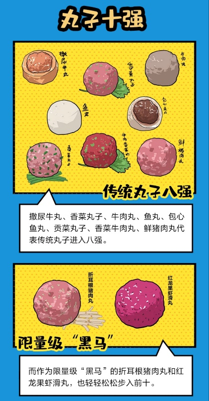 据《成都球迷外卖美食榜》,撒尿牛丸、香菜丸子、牛肉丸、鱼丸、包心鱼丸、贡菜丸子、香菜牛肉丸、鲜猪肉丸代表传统丸子进入八强。而作为限量级“黑马”的折耳根猪肉丸和红龙果虾滑丸,也轻轻松松步入前十。