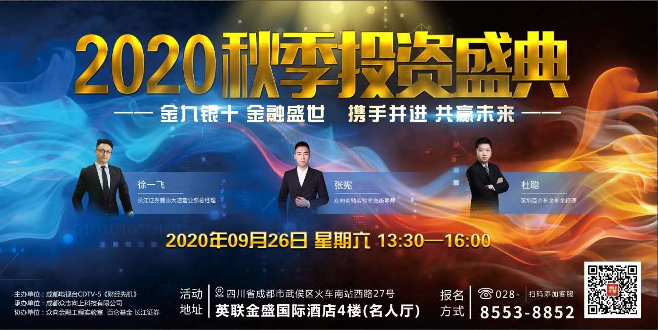 9月26日,《财经先机》秋季大型投资公益讲座将在成都英联金盛国际酒店举行,多位行业大咖和节目嘉宾将亲临现场和大家面对面互动交流,分享金九银十后最具潜力的投资机会,拨打报名热线“028-8553-8852”或扫描屏幕下方二维码,即可免费报名参加。