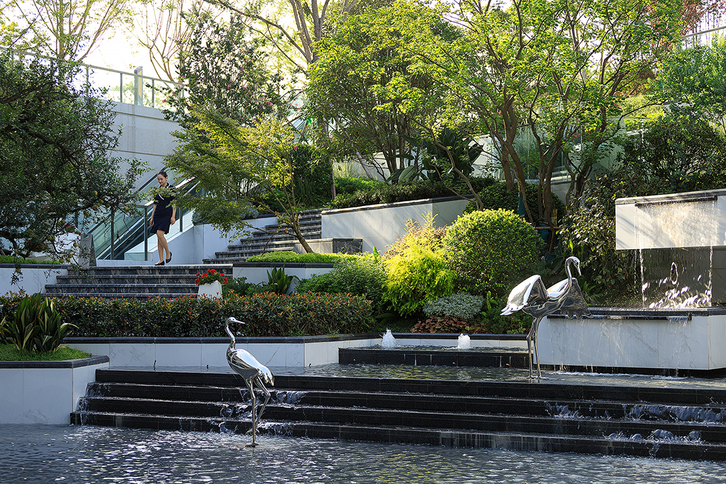 边界种植池里,绿植的搭配和修剪,充满了艺术和秩序感;别有洞天的是,隐秘的下沉式中庭,生机盎然错落有致。落差给予流水活力,悬瀑和溪水相得益彰,又与一簇簇草木声色“合鸣”。