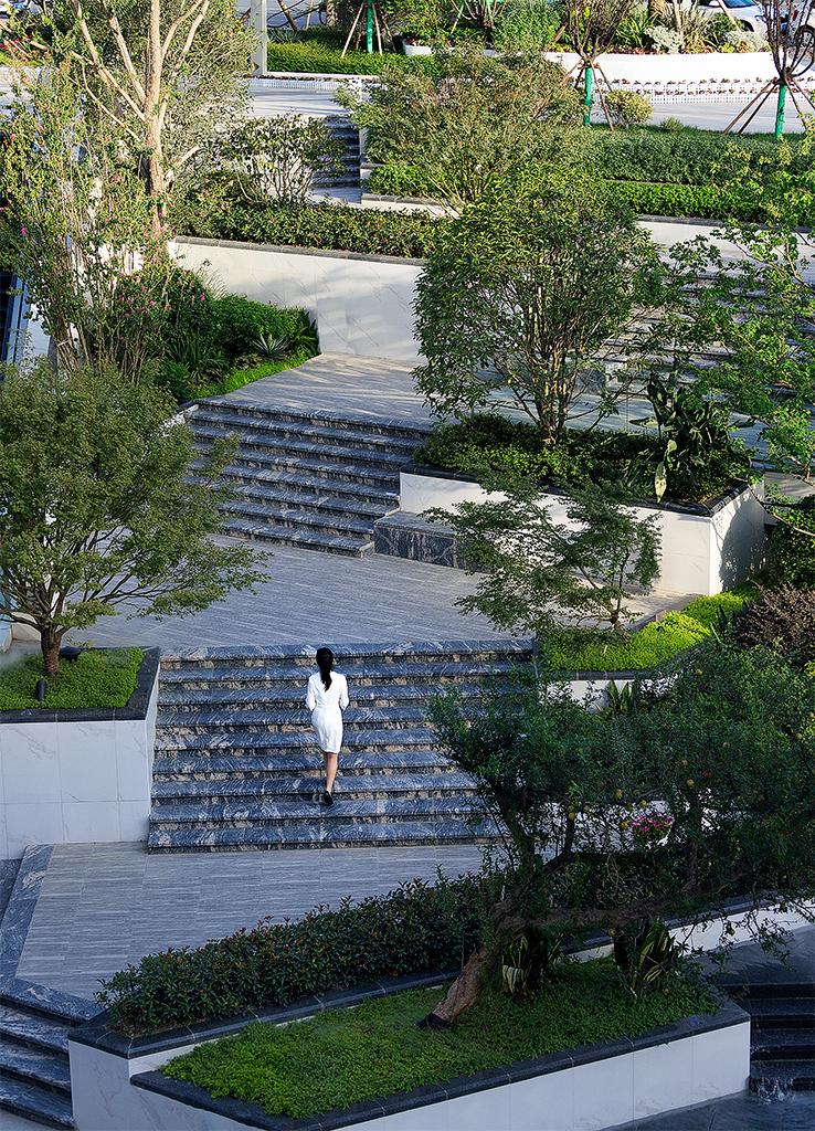 如今,走进陆肖TOD的景观区示范区,已可窥未来公园社区样貌:随着花草间掩映的花径拾级而下,池清水濯濯生光,阶梯水幕潺潺跃动;碧桃、矮松、花灌,围合四周,错落有致,倒映成景。