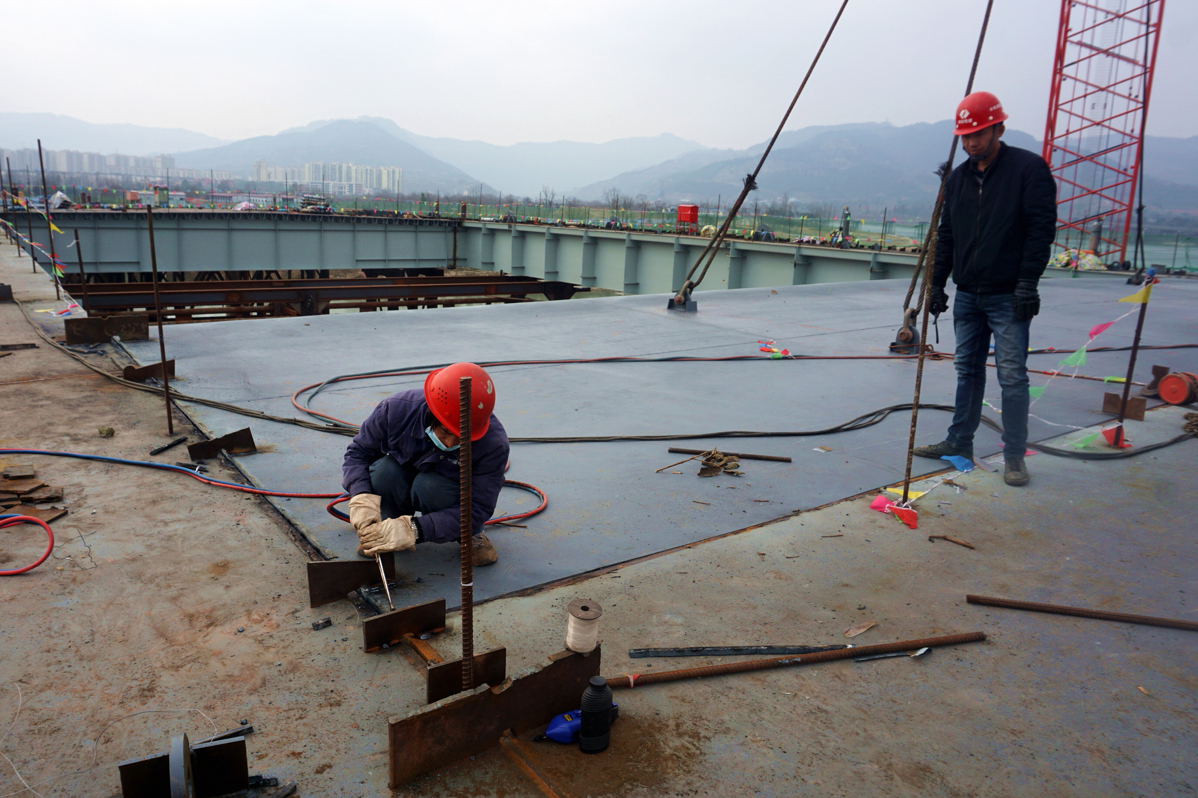 近日,金堂县淮口沙坝的淮州湾大桥(项目名称红岩寺大桥及连接线)建设项目传来捷报,看度记者来到施工现场,远远望见起重机将一块梁段吊装到主梁之上。沿着近5米高的临时扶梯往上走,记者来到了淮州湾大桥的桥面,现场工人们正忙着焊接节段箱梁。