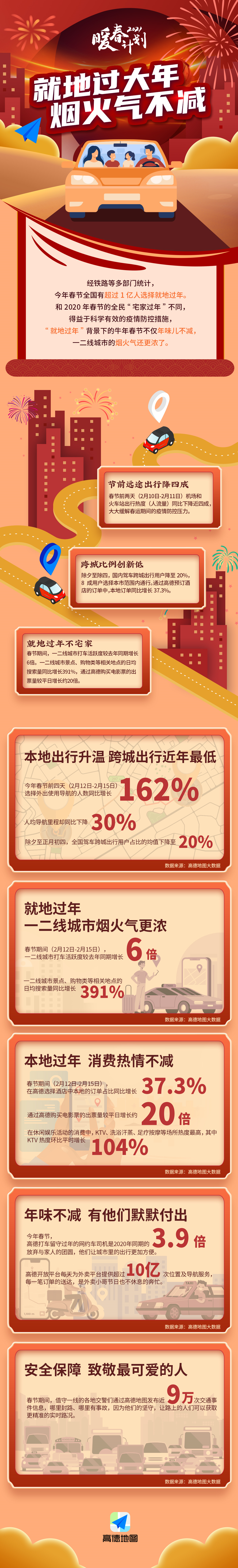 本地过年不减烟火气的背后,离不开千千万万服务人员的默默付出。今年春节,高德打车留守过年的网约车司机是2020年同期的3.9倍,放弃与家人的团圆,他们让城市里的出行更加方便;高德开放平台每天为外卖平台提供超过10亿次位置及导航服务,每一笔订单的送达,是外卖小哥节日夜不休息的奔忙;春节期间,值守一线的各地交警们通过高德地图发布近9万次交通事件信息,他们的坚守,让路上的人们可以获取更精准的实时路况。