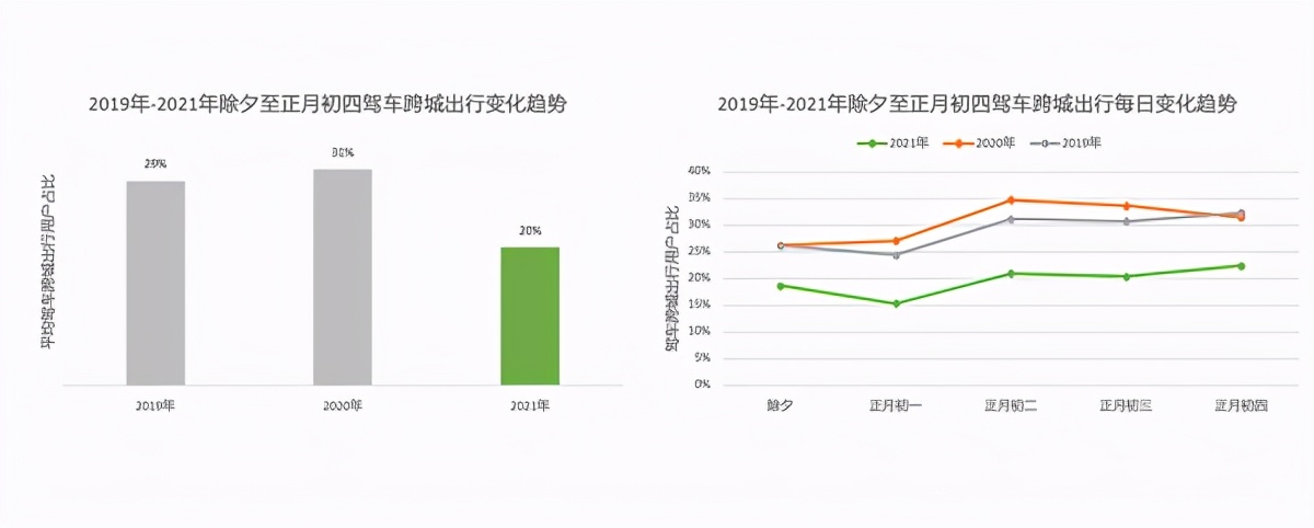 在就地过年的倡议下,2月11日到2月15日(除夕至正月初四),全国驾车跨城出行用户占比的均值较2019年、2020年同期下降明显,由2019年的29%、2020年的31%下降至20%,8成用户将活动范围控制在了本地范围内。